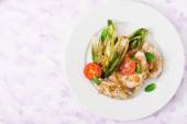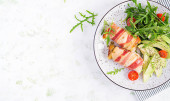Zdjęcie "Grillowana sałatka z serem halloumi z pomidorami i szparagami na talerzu na ciemnym tle. Zdrowe wegetariańskie jedzenie. Widok z góry, powyżej" może być wykorzystywane do celów osobistych i komercyjnych zgodnie z warunkami zakupionej licencji Royalty-free. Obraz jest dostępny do pobrania w jakości wysokiej rozdzielczości do 5760x3840.