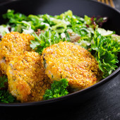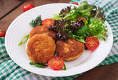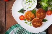 Domowej roboty krokiety rybne z białej ryby w płatki kukurydziane panierowanie. Placki z mielonego dorsza. Pyszny i pożywny obiad lub kolacja.