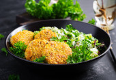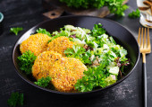 Zdjęcie "Domowej roboty krokiety rybne z białej ryby w płatki kukurydziane panierowanie. Placki z mielonego dorsza. Pyszny i pożywny obiad lub kolacja." może być wykorzystywane do celów osobistych i komercyjnych zgodnie z warunkami zakupionej licencji Royalty-free. Obraz jest dostępny do pobrania w jakości wysokiej rozdzielczości do 5760x3840.