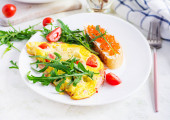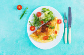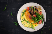 Omelette z serem, zielonymi ziołami i pieczarkami na talerzu. Frittata - włoski omlet. Widok z góry, powyżej, przestrzeń kopiowania
