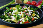 Sałatka warzywna z pomidorem, świeżą sałatą, miękkim serem i cebulą. Zdrowa dieta.