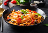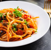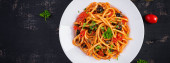 Spaghetti alla puttanesca - włoskie danie z makaronem z pomidorami, czarnymi oliwkami, kaparami, anchois i pietruszką. Widok z góry, płaski