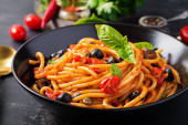 Zdjęcie "Spaghetti alla puttanesca - włoskie danie z makaronem z pomidorami, czarnymi oliwkami, kaparami, anchois i pietruszką. Widok z góry, płaski" może być wykorzystywane do celów osobistych i komercyjnych zgodnie z warunkami zakupionej licencji Royalty-free. Obraz jest dostępny do pobrania w jakości wysokiej rozdzielczości do 5760x3840.