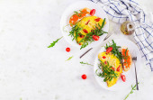 Grillowana sałatka z serem halloumi z pomidorami i szparagami na talerzu na jasnym tle. Zdrowe wegetariańskie jedzenie. Widok z góry