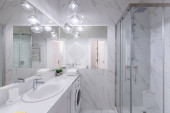 Zdjęcie "zdjęcie wnętrza, mała łazienka, z białymi marmurowymi płytkami i prysznicem" może być wykorzystywane do celów osobistych i komercyjnych zgodnie z warunkami zakupionej licencji Royalty-free. Obraz jest dostępny do pobrania w jakości wysokiej rozdzielczości do 5760x3840.