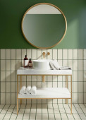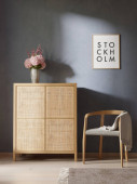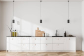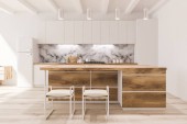 3d renderowanie minimalistycznej kuchni z szarymi szafkami i biały marmur blat i drewno jodełka drewniana podłoga