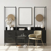 Stół konsolowy ze stołkiem i lustrem na szarej ścianie w pokoju. Projekt wnętrza