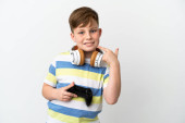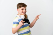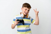 Mały rudy chłopiec trzyma podkładkę gry odizolowany na białym tle świętując zwycięstwo