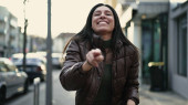 zbliżenie portret uśmiechający się młoda kobieta na tle miejskich