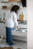 Nowoczesna właścicielka zwierząt domowych gra karmienia psa szkoleniowego w kuchni Jack Russell Terrier rasy