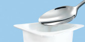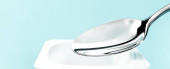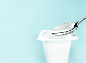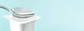 Kubek jogurtowy i srebrna łyżka na pomarańczowym tle, biały plastikowy pojemnik z jogurtowym kremem, świeży nabiał dla zdrowej diety i równowagi żywieniowej