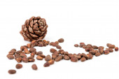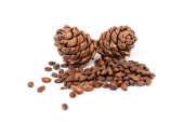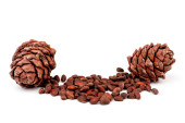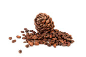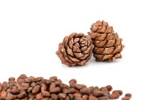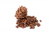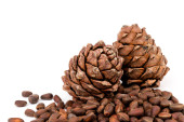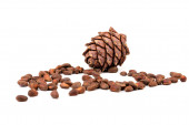 Orzechy cedrowe w skorupie z nieotwartymi szyszkami izolowanymi na białym tle