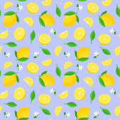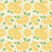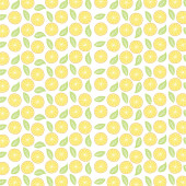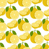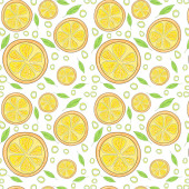 Żółty sok cytrynowy okrągły owoc i pół plasterki z zielonymi liśćmi powtarzają bezszwowy wzór tkanin, ilustracja akwarela ręka rysunek na zielonym tle