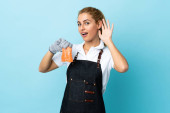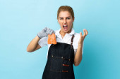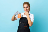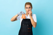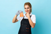 Sprzedawca ryb w fartuchu i trzymający surową rybę nad odizolowanym niebieskim tłem wskazującym palcem w bok