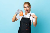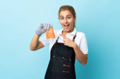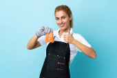 Zdjęcie "Sprzedawca ryb w fartuchu i trzymający surową rybę nad odizolowanym niebieskim tłem wskazującym palcem w bok" może być wykorzystywane do celów osobistych i komercyjnych zgodnie z warunkami zakupionej licencji Royalty-free. Obraz jest dostępny do pobrania w jakości wysokiej rozdzielczości do 5760x3840.