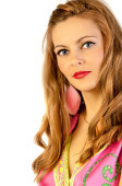 piękna blondynka moder noszenie bielizny czarno -różowe, pozowanie na jasnym tle