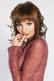 portret piękna brunetka dziewczyna nosi różowy sweter na białym tle