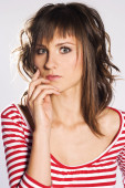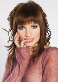 portret piękna brunetka dziewczyna nosi różowy sweter na białym tle