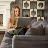 Piękna kobieta zakupy lub czat online w sieci społecznej w domu