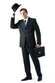 młody biznesmen w garniturze i kapeluszu z laptopa