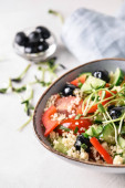 Zdjęcie "Miska z kuskusem i warzywami na jasnym tle" może być wykorzystywane do celów osobistych i komercyjnych zgodnie z warunkami zakupionej licencji Royalty-free. Obraz jest dostępny do pobrania w jakości wysokiej rozdzielczości do 5760x3840.