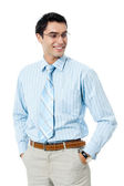 portret szczęśliwy uśmiechający się młody człowiek, na białym tle