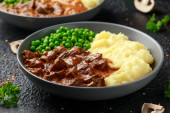 Wolno ugotowany stek Diane Zapiekanka z grzybami. tłuczone ziemniaki i groszek zielony