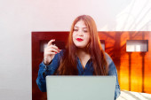 zmysłowy i szczęśliwy Latynoska kobieta zrelaksowany w jej łóżku robi zakupy online z karty kredytowej i laptopa