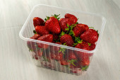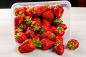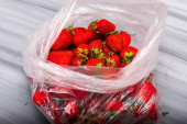 dojrzałe soczyste czerwone truskawki w plastikowej torbie na drewnianym stole z bliska. Wysokiej jakości zdjęcie
