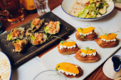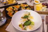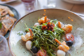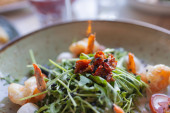Zdjęcie "Świeża sałatka z krewetek Cezar pyszne krewetki, rukola, szpinak, kapusta, rukola, jajko, parmezan i pomidor wiśniowy na drewnianym tle. Olej, sól i pieprz. Zdrowa i dietetyczna koncepcja żywności." może być wykorzystywane do celów osobistych i komercyjnych zgodnie z warunkami zakupionej licencji Royalty-free. Obraz jest dostępny do pobrania w jakości wysokiej rozdzielczości do 5760x3840.