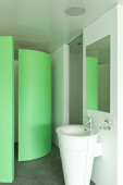 Zdjęcie "Nowoczesny korytarz z zielonymi ścianami, oświetlenie sufitowe, duże lustro, szara podłoga i białe drzwi i szafy" może być wykorzystywane do celów osobistych i komercyjnych zgodnie z warunkami zakupionej licencji Royalty-free. Obraz jest dostępny do pobrania w jakości wysokiej rozdzielczości do 5760x3840.