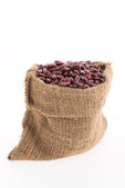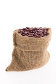 Zbliżenie Organic Rajma, (Laal Lobia) lub czerwone ziarna nerki dal w stojącej torbie jute na drewnianym brązowym tle.