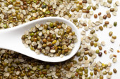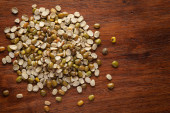 Makro zbliżenie organicznych rozszczepionych i niepolerowanych Green Moong Dal (Vigna radiata) na matie z juty i drewnianym wierzchu.