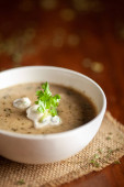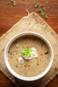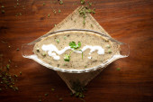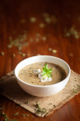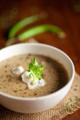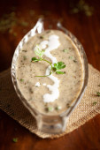 Zbliżenie Methi-Matar-Malai z białym curry ze świeżymi zielonymi chili, liśćmi mięty i cebulą. Popularny, pyszny indyjski przepis w czarnej misce na drewnianym tle.