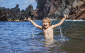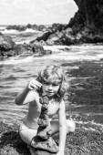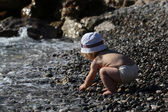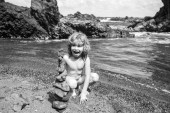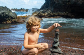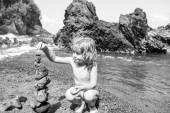 Podekscytowany chłopiec robi kamienie piramidy na żwirowej plaży symbolizującej stabilność, zen, harmonię, równowagę.
