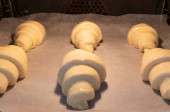 Croissant niepieczone świeże na pokładzie z papieru do pieczenia na domowe śniadanie