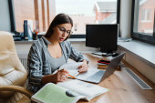 Piękna młoda kobieta przedsiębiorca pracuje z dokumentami podczas siedzenia w biurze
