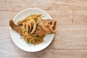 Pyszne makaron z azjatyckiego mięsa, warzyw i nasion marynowanych w sosie yakisoba