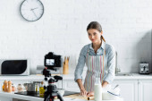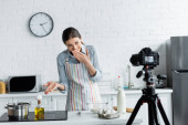 niewyraźne aparat cyfrowy w pobliżu młody gospodyni domowa pokazuje czas gotowania w pobliżu piekarnik