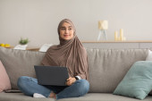 Szczęśliwy starszy muzułmanin pani za pomocą laptopa w domu, noszenie hidżab