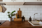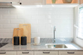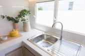 New sink and modern tap in stylish kitchen. Luxury new kitchen with marble top. Modern kitchen interior.