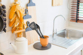 Zdjęcie "New sink and modern tap in stylish kitchen. Luxury new kitchen with marble top. Modern kitchen interior." może być wykorzystywane do celów osobistych i komercyjnych zgodnie z warunkami zakupionej licencji Royalty-free. Obraz jest dostępny do pobrania w jakości wysokiej rozdzielczości do 5760x3840.