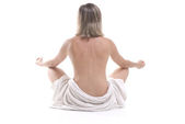 portret młodego pięknego kaukaski kobiety w pozycji jogi, niebieski ręcznik wokół talii, na białym tle