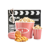 Wiadra ze smacznym popcornem i bilety do kina na białym tle