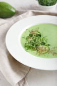 Miska z zielonym gazpacho i składników na jasnym tle