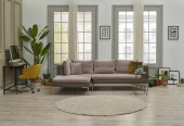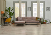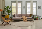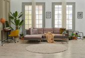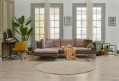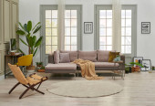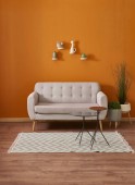 Szara sofa i stół pracy w stylu komputera w salonie przed oknem, dywan poduszki i zasłony stylu, zielone wnętrze roślin.
