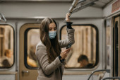 Zdjęcie "Kobieta w masce medycznej, aby uniknąć rozprzestrzeniania się koronawirusu stoi i trzyma smartfona w nowoczesnym wagonie metra. Dziewczyna w masce chirurgicznej przeciwko COVID-19 jedzie metrem." może być wykorzystywane do celów osobistych i komercyjnych zgodnie z warunkami zakupionej licencji Royalty-free. Obraz jest dostępny do pobrania w jakości wysokiej rozdzielczości do 5760x3840.