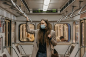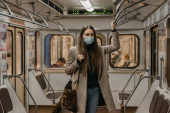 Kobieta w masce medycznej, aby uniknąć rozprzestrzeniania się koronawirusu stoi i trzyma smartfona w nowoczesnym wagonie metra. Dziewczyna w masce chirurgicznej przeciwko COVID-19 jedzie metrem.