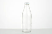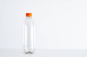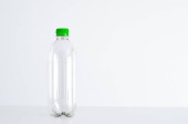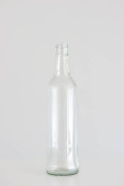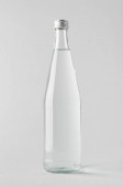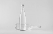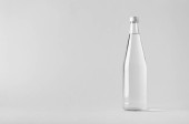 Pusta butelka z przezroczystego szkła izolowana na jasnoszarym tle.