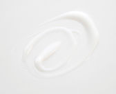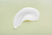 Kosmetyczny krem pędzle tekstury rozmazane na zielonym tle, zbliżenie. Białe próbki produktu do pielęgnacji skóry na szarej powierzchni.